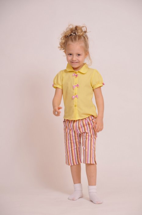 1-465 Бриджи из ткани в модную полоску, пояс из ткани с резиной, состав: 95%хл, 5% - полиэстер, цвет: набивной рисунок - цветная полоска, размеры 26-32 Цена 230,00